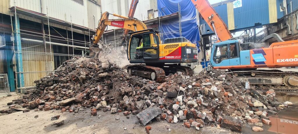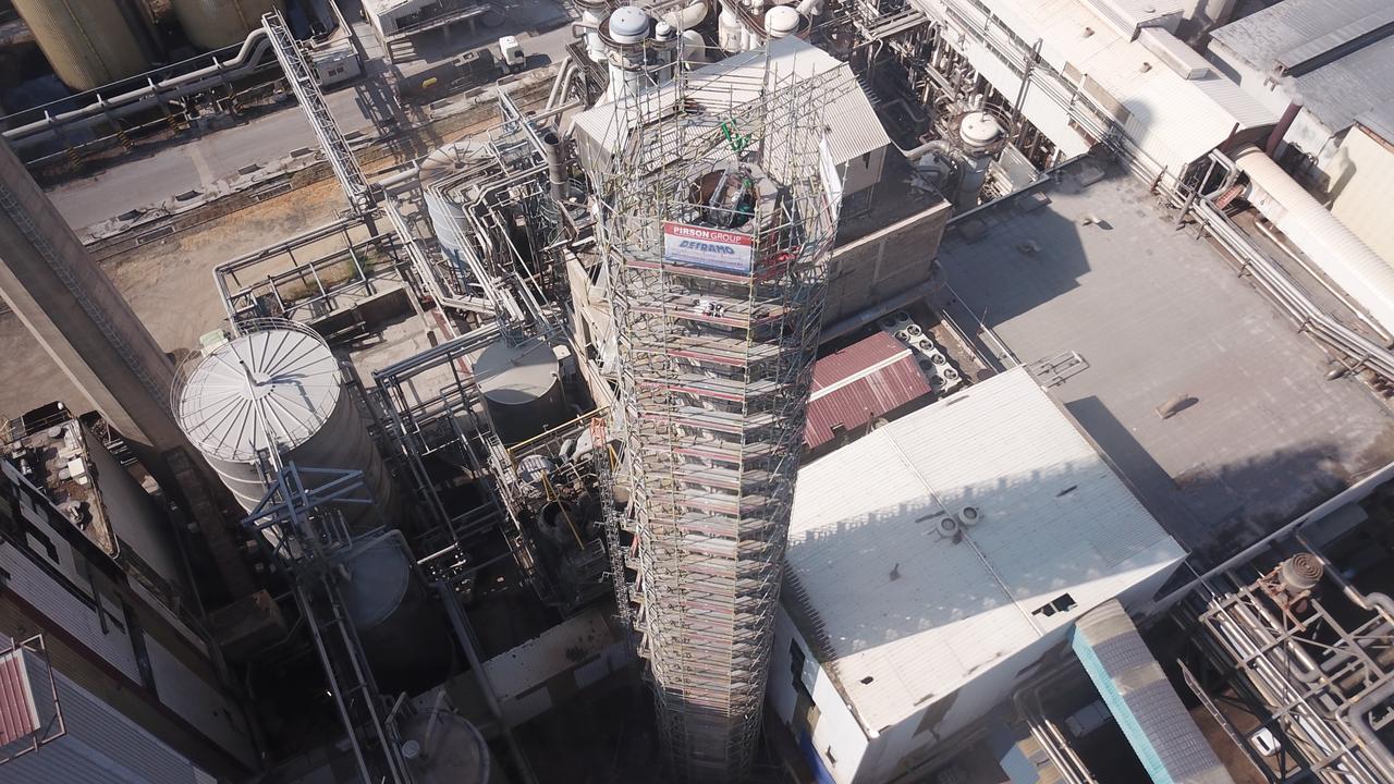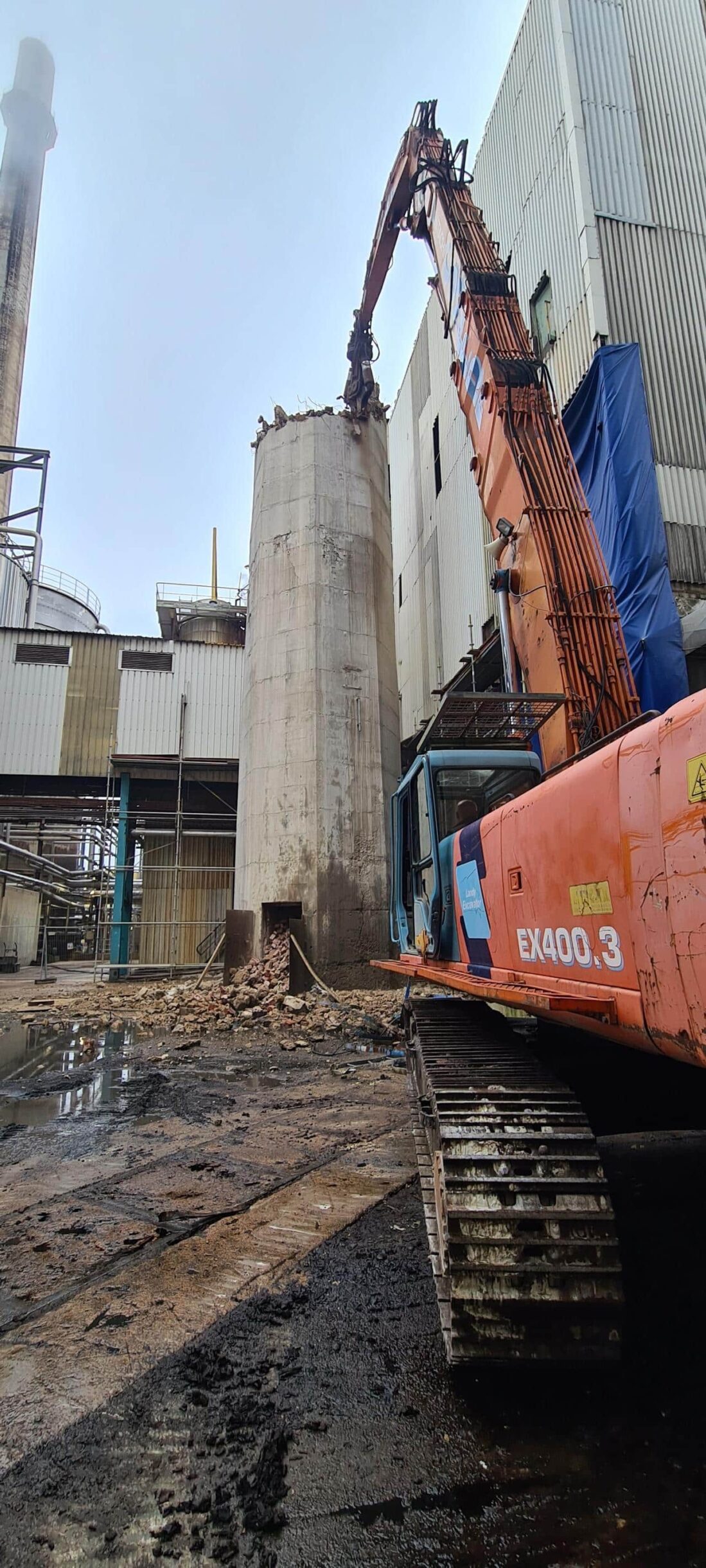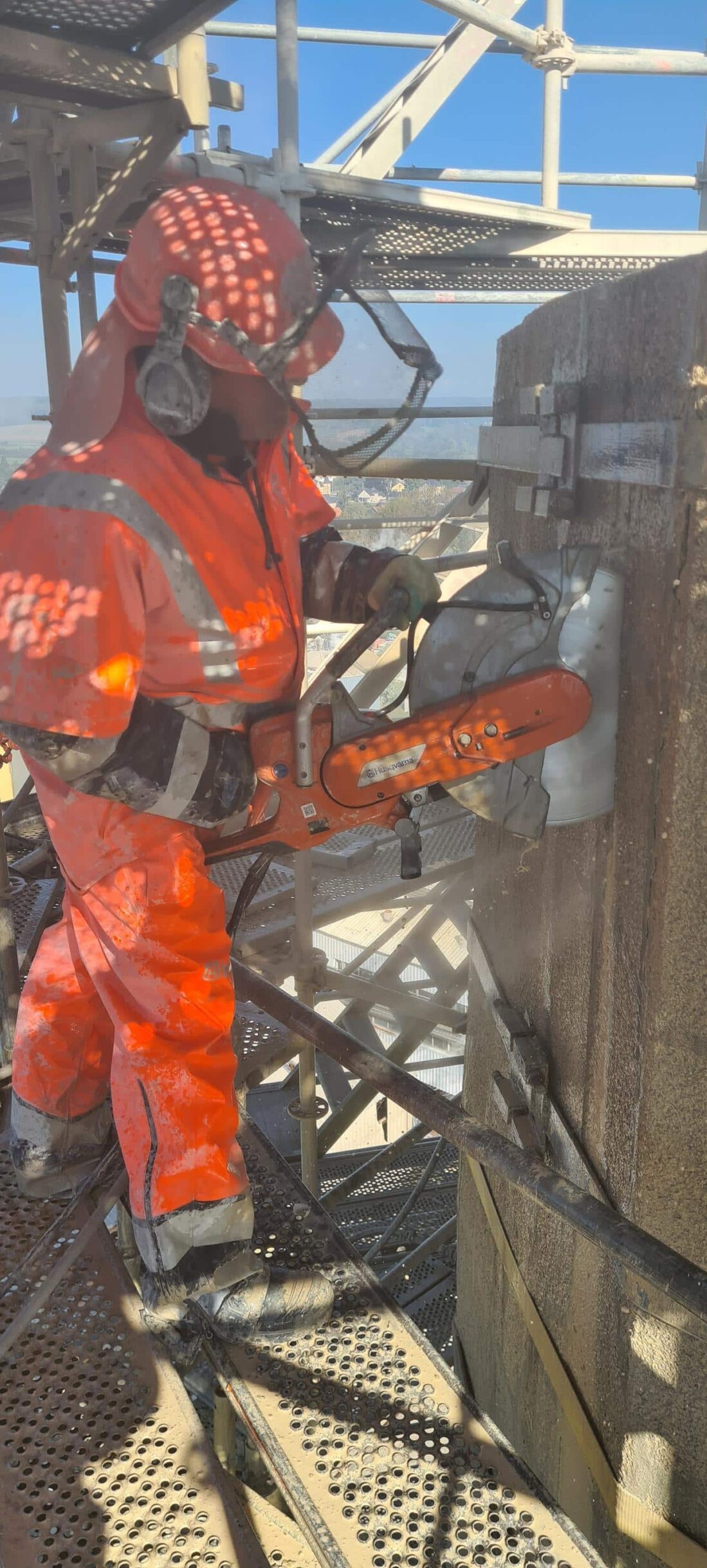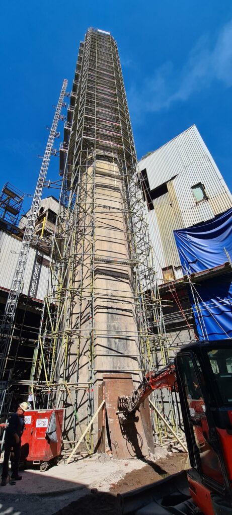Démolition/sciage d’une cheminée béton 62m de hauteur en plein cœur d’une usine en production.